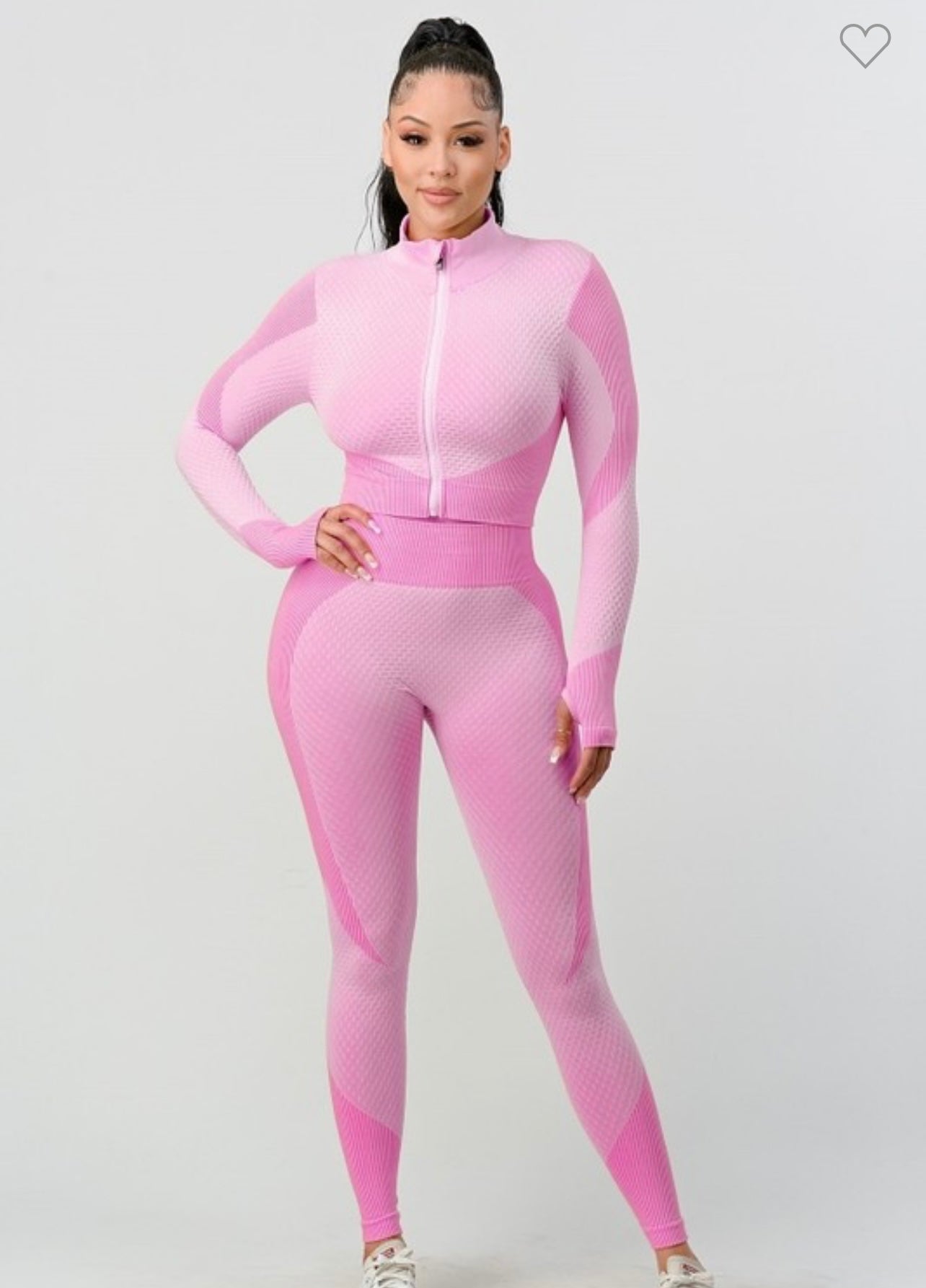 Honey combed textured material with linear detail. Cropped zip up top and leggings 71% polyester 8% spandex