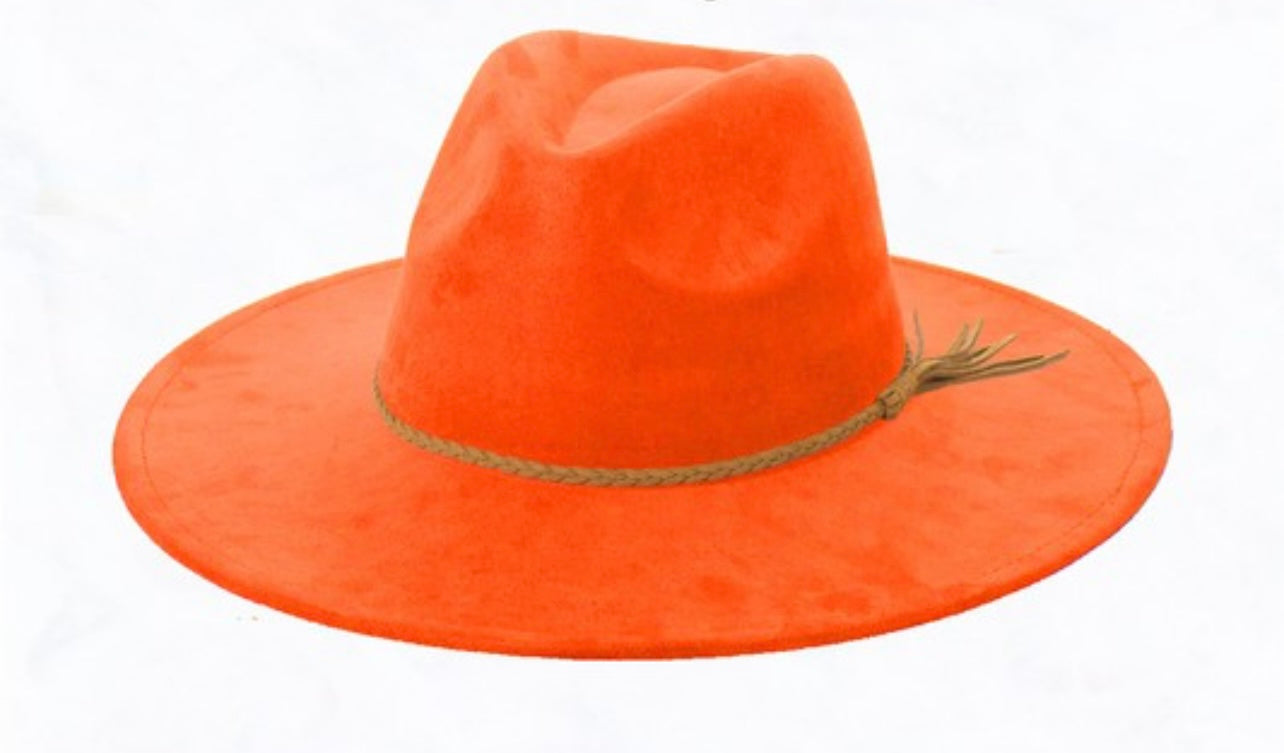 Suede Large Eaves Peach Top Fedora Hat with Braided Leather Belt Hat Height : 4.7"(inch) Brim Size: 3.8"(inch) Weight : 0.308LB 100% Polyester Made in China